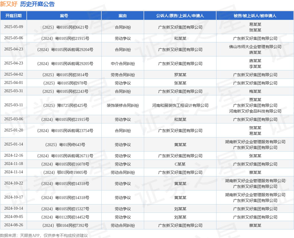 案号:(2025)粤0105民初978号审理法院:广州市海珠区人民法院案由:劳动争议当事人信息: 原告/上诉人:张某某 被告/被上诉人:广东新又好集团有限公司开庭日期:2025年4月1日根据统计,近一年内以广东新又好集团有限公司为当事人的历史开庭公告有19则,其中案由为“劳动争议”的公告以10则居首,其次为“合同纠纷”有4则,“劳动合同纠纷”有2则。历史开庭公告如下: